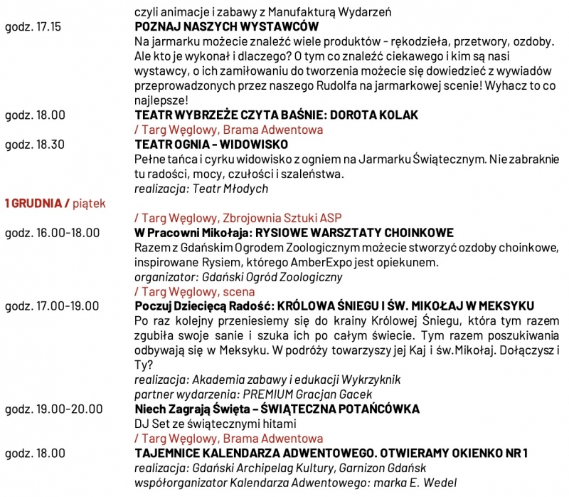 Jarmark Bożonarodzeniowy to nie tylko zakupy i jedzenie. To szereg wydarzeń których listę publikujemy poniżej.