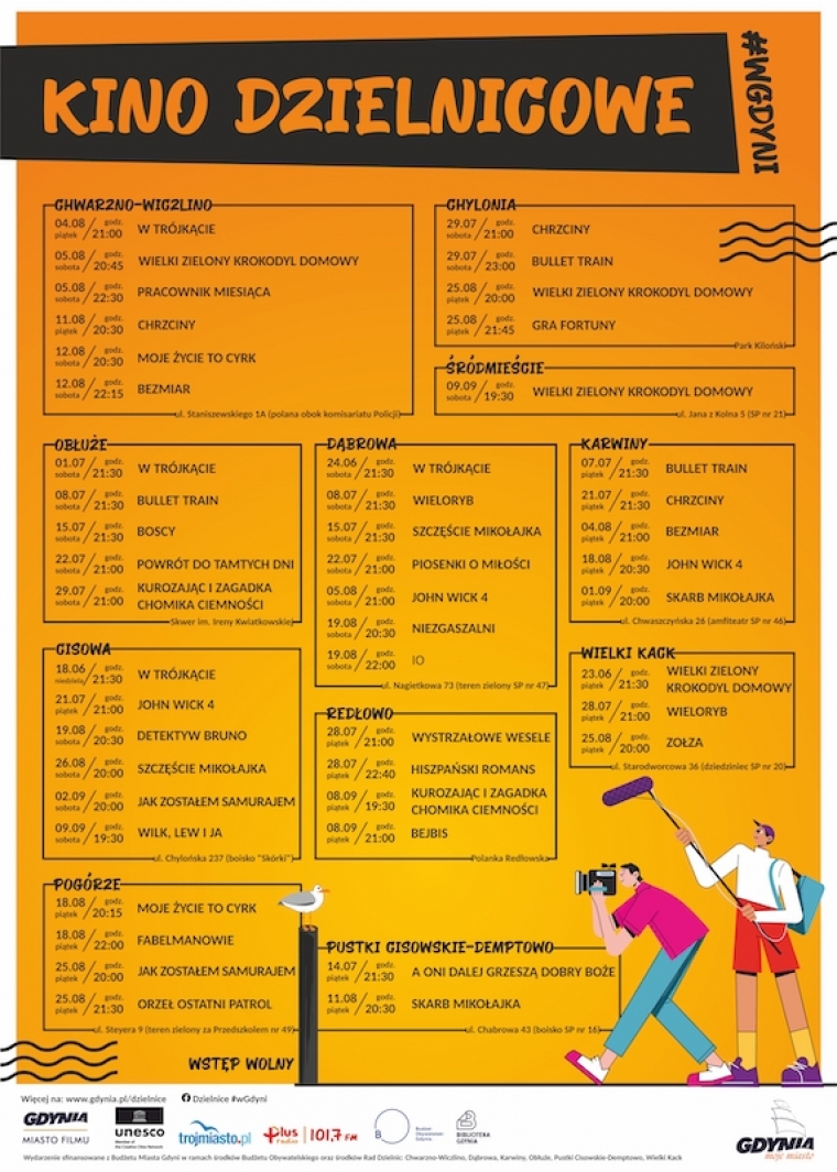 Projekcje potrwają do 9 września. Odbywać się będą w weekendy, we wszystkich miejscach do dyspozycji widzów będą wygodne rozkładane krzesła i duży ekran a wstęp na wydarzenia jest bezpłatny. Tegoroczne kino dzielnicowe zainaugurowała 18 czerwca projekcja filmu „W Trójkącie", podczas pikniku rodzinnego w Cisowej. Wczoraj letnim kinem cieszyli się mieszkańcy dzienic Obłuże i Dąbrowa. Poniżej dokładny repertuar seansów we wszystkich 11 dzielncach.
